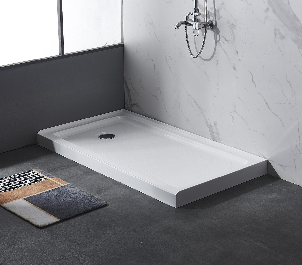 Acrylic shower tray , made by acrylic sheet , reinforced by resin & fiberglass , the frame and legs are optional. Usually have 800×800/ 900×900/1000x1000mm sizes , also have other rectangular shape . It have high glossy surface , anti-slip design can be added .